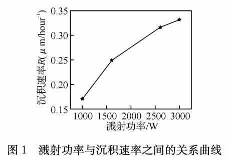 實(shí)驗(yàn)研究發(fā)現(xiàn)濺射功率是影響沉積速率的一個(gè)最直接的因素。通過(guò)樣品1#、2#、3#、4#的透過(guò)率曲線,計(jì)算薄膜的厚度。圖1給出了樣品1#、2#、3#、4#的沉積速率與濺射功率之間的關(guān)系曲線。
