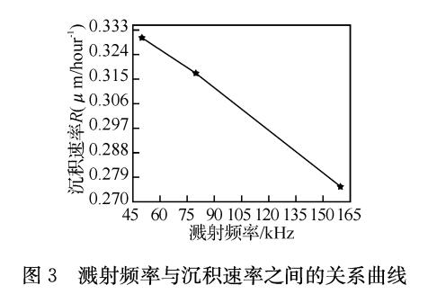 改變?yōu)R射頻率,在其他的工藝參數(shù)相同的條件下得到沉積速率與濺射頻率之間的關(guān)系。圖3是樣品4#、7#、8#的沉積速率與濺射頻率之間的關(guān)系曲線。從圖中可以看出沉積速率隨濺射頻率的減小而線性增大。當(dāng)工作場(chǎng)強(qiáng)為定值時(shí),頻率越高,等離子體中正離子被加速的時(shí)間越短,正離子從外電場(chǎng)吸收的能量就越少,轟擊靶的正離子能量也越低,靶的濺射速率也越低。