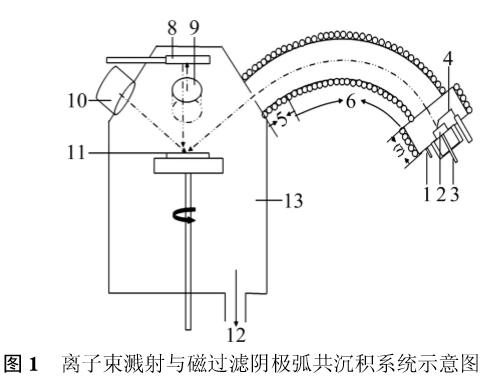 用于制備TiSiN納米復合薄膜的方法已有很多,如化學氣相沉積、磁控濺射、離子束濺射、陰極弧離子鍍等,而PVD物理氣相沉積溫度較低(300~400℃),且避免了危險氣體的使用,更便于工業化應用。其中陰極弧離子鍍產生的等離子體具有離化率、離子能量高的特點,更有利于提高涂層的致密性和結合力。針對硅靶導電性、熱脹性差,不易作為陰極弧靶,BENDAVID等小組做了多種嘗試,首先是采用Ti/Si合金靶,但是其固定比例降低了薄膜成分可控性;隨后將陰極弧與CVD相結合,通入硅烷氣體提供硅源,Ti陰極弧提供Ti離子。同時,BENDAVID等和KIM等都采用了磁控濺射硅靶與Ti陰極弧相結合的方法。這兩種方法都制備出了成分可控的超硬納米復合膜,并且研究了參數對薄膜成分、微觀結構以及硬度的影響。最近有一種新技術是將離子束濺射與帶有90°磁過濾彎管的陰極弧相結合來制備TiSiN薄膜。由磁過濾Ti陰極弧提供Ti離子,離子束濺射αSi3N4靶,提供Si源。其中陰極弧的90°磁過濾彎管可以過濾掉陰極弧產生的微米級大顆粒,使薄膜更平滑致密。Si以Si3N4的形式摻入,避免了Si的氮化不充分性。本文作者采用這種離子束濺射與磁過濾陰極弧共沉積法制備TiSiN納米復合薄膜,并研究沉積參數對薄膜成分、結構,以及硬度、模量、摩擦磨損等力學性能的影響。