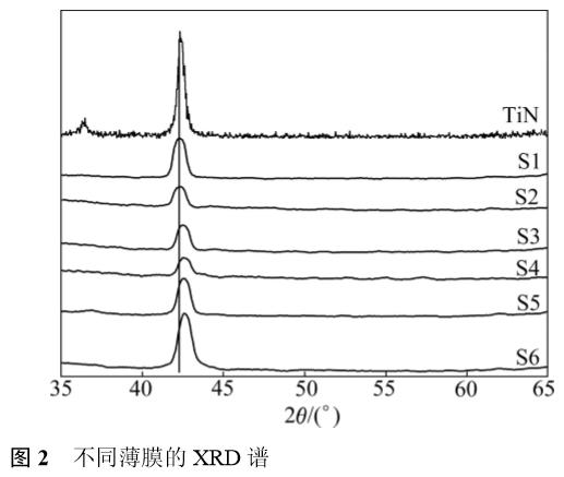 表1所列為6個樣品(S1~S6)的EDS分析結果。由表1可知,薄膜中N含量(摩爾分數)保持基本不變,隨著Si含量的增大,Ti含量逐漸下降。通過改變離子束濺射的束流和磁過濾線圈電流使薄膜中Si含量具有較強的可控性,所制備的TiSiN薄膜中Si含量在3.2%~15.5%的范圍。圖2所示為不同薄膜的XRD譜。從圖2可以看出,純TiN薄膜為面心立方(FCC)結構,具有(200)面擇優取向。TiSiN薄膜中晶相同樣具有(200)面擇優取向的FCC結構,且(200)峰明顯寬化。根據TiN薄膜的研究結果,當薄膜中不存在或存在較小的殘余應力時,以表面能最小的(200)面擇優取向。由此可見,樣品S1~S6中的殘余應力均較小。圖2中未出現晶相Si3N4和鈦硅化物的衍射峰,Si除了可能以非晶態Si3N4形式存在之外,由于物理氣相沉積的過程往往被認為是極不平衡的過程,所以還有可能以Ti(Si)N固溶體的形式存在,當固溶體中的Si達到飽和之后才能形成非晶態Si3N4。當TiN中部分Ti元素被Si元素取代后,由于Si的半徑小于Ti,必然會導致其晶格常數的降低。圖2中樣品S1~S3隨著Si含量的增加,(200)晶面逐漸向高角移動,之后穩定在42.6°。由此可見,樣品S1~S3薄膜中晶相是以Ti(Si)N固溶體的形式存在,當固溶體中Si飽和后,又有非晶態Si3N4相出現。根據(200)晶面衍射峰的半高寬,利用謝樂公式計算了薄膜中的晶粒尺寸,如圖3所示。TiSiN薄膜中的晶粒尺寸在20~30nm之間。隨著Si的摻入,晶粒尺寸變化不大,只在Si含量大于10.9%之后明顯下降。此現象與其他研究結構相似,非晶相Si3N4的出現,限制了晶粒的進一步生長,導致了晶粒粒徑的下降。