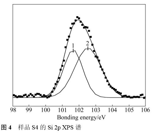 從XRD結果分析得到的信息在XPS結果中得到進一步的證明。圖4所示為薄膜樣品S4中的Si2pXPS譜。經過擬合分峰,從圖4可以看出,樣品S4(Si含量10.9%)中的Si2p峰由兩個峰合成,1號峰位于101.7eV附近,與Si3N4中的Si2p峰位一致,2號峰位于102.6eV附近,應該對應于Ti(Si)N固溶體中Si2p的結合能,由于它既不對應于更高鍵能的SiO2(103.1eV)中的Si,也不對應于較低鍵能的TiSi(98.8eV)中的Si,且與所報道的非平衡狀態Ti(Si)N固溶體中Si2p峰的峰位相吻合。結合XRD結果可知,薄膜中晶相是以Ti(Si)N固溶體的形式存在,當固溶體中Si飽和后,又有非晶態Si3N4相出現。由此可見,即使利用了磁過濾陰極弧這種離化率和離子能量較高的方法,在不對基底加熱、加負偏壓的情況下,仍然不利于TiN和Si3N4的兩相分離。