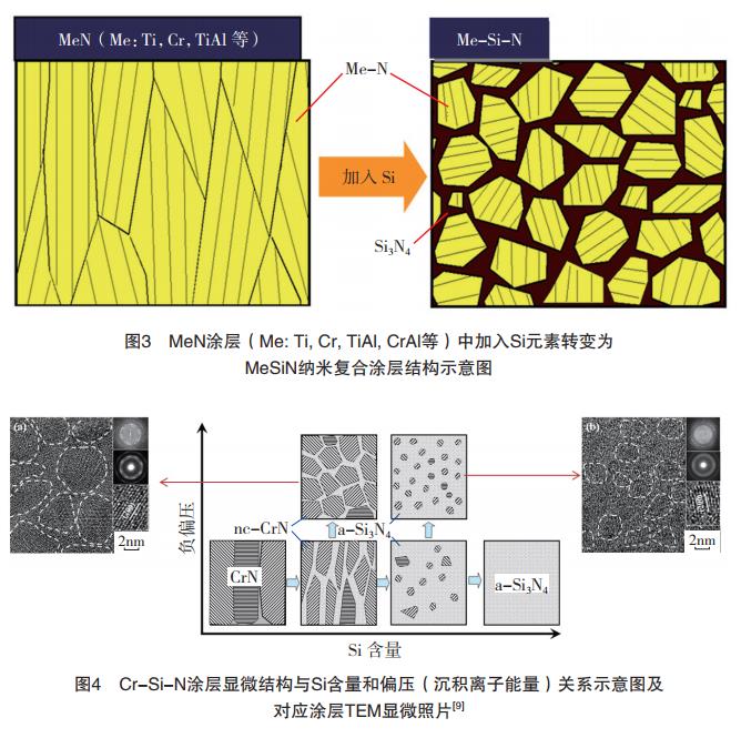 PVD技術制備Me-Si-N納米復合涂層的難點在于對納米相晶粒大小、形狀和分布、非晶相厚度的控制,等通過沉積涂層的成分和離子能量的控制(圖4),實現了納米復合涂層的可控生長;余東海等采用空心陰極和磁控濺射復合離子鍍技術制備了TiAlSiN、TiCrSiN多元納米復合涂層刀具,高速銑削淬硬鋼取得較好效果。