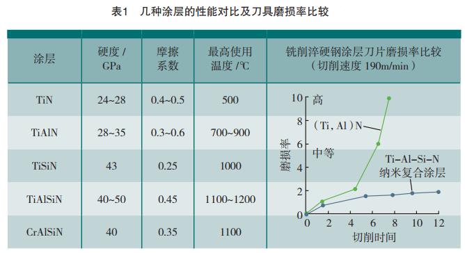 部分公司開發了納米復合結構的刀具涂層。S.Carvalho等采用直流反應磁控濺射方法制備了納米復合涂層刀具,并將該涂層與目前市場上適合高速切削的多層涂層(TiCN/Al2O3/TiN)的切削性能進行了比較,結果顯示,TiAlSiN納米復合涂層刀具在Vc=200m/min的條件高速車削合金鋼,比TiN多層涂層刀具磨損小,且工件表面粗糙度小于4μm,比TiN多層涂層刀具加工的工件表面質量(12μm)有很大提高。P公司的新一代nc-Ti1-xAlxN/(a-Si3N4)納米復合涂層刀具,是在強等離子體作用下,3nm的TiAlN晶體被鑲嵌在非晶態的Si3N4體內,晶粒之間為1nm厚的Si3N4。這種結構使涂層硬度可達到50GPa,摩擦系數為0.45,且高溫硬度更是非常突出,最高使用溫度可達1100℃,溫度達到時,其硬度值仍可保持在30GPa。日本公司開發的TiSiN涂層刀具(“TH”涂層)改善了加工高硬度材料時,TiN涂層刀具長期以來未能解決的涂層氧化和硬度欠佳問題。用“TH”涂層刀具高速加工拉伸模材料(HRC62)時與TiAlN涂層刀具相比加工成本降低54%。表1列出了幾種納米復合涂層與傳統TiN和TiAlN涂層的性能對比。
