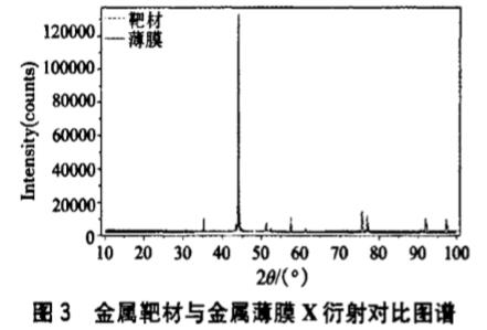 由圖1靶材衍射峰半高寬計算可得靶材晶粒尺寸D2為47.6nm。由此可以得出結論,薄膜晶面衍射峰寬化是PVD薄膜晶粒細小的原因之一。而用磁控濺射法制備出的薄膜晶粒尺寸小于金屬靶材晶粒尺寸,這是因為磁控濺射法制備薄膜時,真空室中溫度較低,基片未經過加熱處理,使達到基底表面的金屬粒子動能減小,在基底表面上凝結,只能得到很小的晶粒甚至得到無定形薄膜。