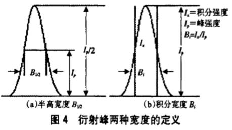 可求得晶粒在垂直(hkl)面方向的尺度D。K與晶粒形狀、分布等有關,但通常取值為1(或0.9),λ為X射線波長,θ為Bragg角,B為衍射峰的半高寬,以弧度為單位。B的測算方法常用方法如下,見圖4。