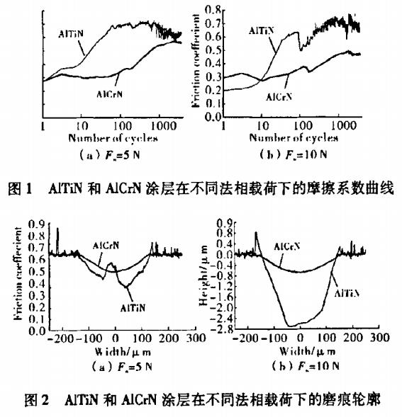 圖1示出了AITiN和AlCrN涂層在不同法向載荷下的往返滑動摩擦系數曲線,可見AITiN涂層的摩擦系數在經歷爬升階段后出現明顯抖動,表明摩擦接觸界面內存在較大的不穩定性。相對AITiN涂層而言,AJ-CrN涂層的摩擦系數值明顯較低,且曲線平穩性較好。此外,AlCrN涂層摩擦系數曲線的爬升階段較長,且在經歷短暫的下降階段后曲線趨于平穩。