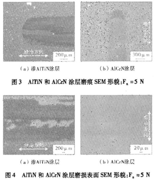 ?。?)AlCrN涂層的耐磨性明顯優于AlTiN涂層。相比AlTiN涂層,AlCrN涂層擁有良好的排屑機制,優越的抗磨粒磨損和抗氧化磨損性能,從而極大地拓寬了PVD硬質圖層的摩擦學應用范圍。