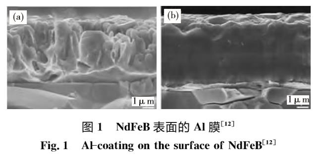 MaoSD等采用直流磁控濺射技術(shù)在NdFeB上沉積Al膜,得到呈柱狀晶結(jié)構(gòu)的Al薄膜,如圖1(a)所示。研究表明,磁控濺射鍍鋁提高了磁體的耐腐蝕性能;由于鍍鋁層柱狀晶間的微孔貫穿薄膜,因此帶有Al防護鍍層的Nd-FeB材料腐蝕時,腐蝕液會通過這些微孔到達基體。MaoSD等又采用了離子束輔助磁控濺射(Ion-beam-assisteddeposition,IBAD)的方法在NdFeB表面制備了Al膜,見圖1(b),可以看出柱狀晶結(jié)構(gòu)消失,膜層更加均勻和致密,結(jié)果表明,經(jīng)240h中性鹽霧試驗后,磁控濺射的純Al薄膜表面出現(xiàn)大面積的紅銹,但IBAD制備的Al膜表面只有少量的紅銹,其耐蝕性能明顯提高,這主要是由于IBAD-Al膜層中存在更多致密的氧化膜。MaoSD等也采用等離子體輔助磁控濺射法制備了Al/Al2O3多層膜。
