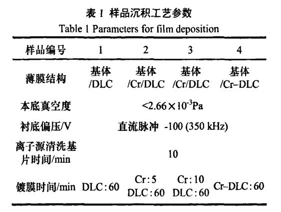 研究采用線性離子束混合磁控濺射在WC硬質合金、Si基體上沉積了DLC膜,Cr/DLC膜以及Cr-DLC膜。該設備配備有1個38cm長的線性離子束和1個矩形直流磁控濺射靶,在DLC膜沉積時,單獨開啟線性離子束,通入碳源氣體C2H2;沉積Cr/DLC膜時,先進行鉻靶濺射,形成Cr應力緩沖層,然后再沉積DLC膜;制備Cr-DLC薄膜時,則同時開啟磁控濺射鉻靶和線性離子束源進行復合薄膜的沉積。基體樣品在丙酮、酒精、去離子水中經過10分鐘超聲波清洗,熱風吹干后放入真空室內。為了提高薄膜與基體的附著力,沉積成膜前對基體進行了10分鐘的Ar離子清洗,具體樣品沉積參數見表1。