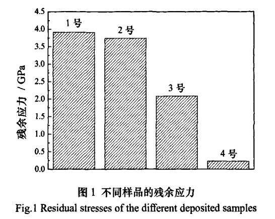 圖1為測得4個樣品的殘余應力,從圖中可以看出,當DLC薄膜中引入Cr過渡層后,薄膜的殘余應力得到了降低,其中當過渡層Cr的厚度約為250nm時,殘余應力出現了約50%的明顯降低,從3.9GPa降至2.0GPa,而過渡層cr厚度為130nm時,其殘余應力變化不大,這說明應力緩沖層具有一個最佳厚度,太薄時,其應力緩沖作用不明顯。該組樣品中,Crj參雜的DLC薄膜殘余應力最低,為0.23GPa。這是因為采用膜基間設置過渡層的方法時,只是緩解了因膜基界面問的不整合性或熱膨脹因數不匹配而產生的應力,但是薄膜內部本征應力并沒有得到緩解,而根據我們前期的試驗結果,在DLC薄膜中摻雜金屬cr時,可在薄膜內部形成納米量級的納米碳化鉻晶體相,這些納米微粒的出現為DLC薄膜網絡結構中的局域應力釋放提供了條件,從而導致薄膜生長過程中的本征殘余應力極大降低,對外表現為極低的殘余應力。