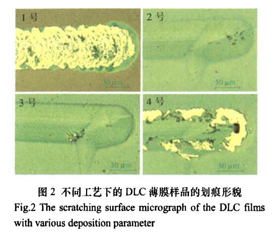 從圖2劃痕形貌來看,1和4號工藝沉積的薄膜劃痕較寬,發生了明顯的剝離,其中l號薄膜為魚鱗狀剝離失效,薄膜幾乎全部剝落,4號樣品則為片狀的局域剝落。而2和3號樣品無明顯的剝落現象,只是在薄膜沿劃痕兩邊形成整齊排列的小裂紋,呈魚骨狀,顯示出良好的膜基結合力。