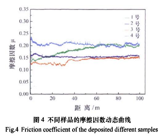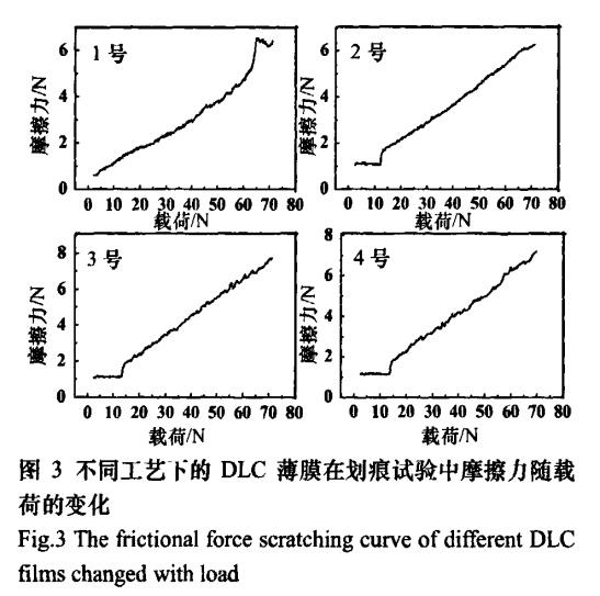 在劃痕試驗的測試中,加載過程中聲信號均無明顯的變化,于是僅給出劃痕測試過程中的摩擦力變化曲線,如圖3所示。對照于劃痕形貌,可以得出,1號樣品的臨界載荷約20N左右,而2號、3號樣品均無薄膜剝落現象,基本判斷其結合力高于70N,4號樣品的臨界載荷為45N左右。