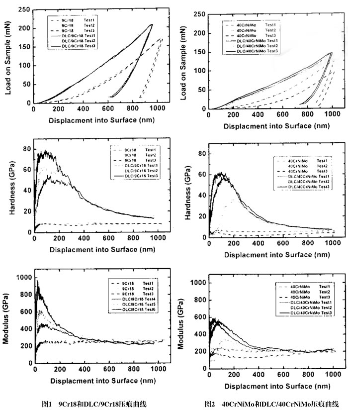 為了便于比較,9Cr18在深度為1um處對應(yīng)的載荷、硬度、模量平均分別約為170nM,8GPa,245GPa,40CrNiMo的值分別為120mN,5.5GPa,500GPa。9Cr18的硬度和模量高于40CrNiMo,見圖1和圖2,由于DLC膜的厚度只有0.2um,必須依靠硬基體來承受外加載荷,這里需指出的是,納米壓痕硬度的定義為在某一壓入深度或時刻的壓痕投影上單位面積所承受的力,它是樣品對接觸載荷承受能力的度量,納米壓痕硬度是通過測量出壓痕深度后再根據(jù)經(jīng)驗公式計算出接觸面積。