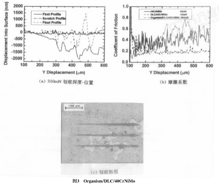 圖3(a)為Organism/DLC/40CrNiMo在最大法向載荷300mN時的納米劃痕實驗結(jié)果,實驗主要分三步,預(yù)掃描(First Profile)得到試樣表面的形貌或粗糙度,刻掃描(Scratch Profile)記錄壓頭在垂直線性增加載荷作用下的劃痕深度和位置的關(guān)系,在初始階段,隨著線性載荷的增加,劃痕深度也近似線性增加,對應(yīng)的摩擦系數(shù)較小(圖3b),估計在Organism/DLC刻劃,當(dāng)劃痕位置為240um時,劃痕曲線出現(xiàn)波動,位置為300um時,劃痕曲線明顯波動(見圖3a)對應(yīng)的摩擦系數(shù)也明顯增加(圖3b),該曲線對應(yīng)的劃痕照片為圖3c最下面那條劃痕,這說明壓針劃到基體中并有碎片剝落,后掃描(Final Profile)反映卸載后殘余劃痕的形貌,即表面損壞信息,在300um~600um范圍內(nèi)有異常,對應(yīng)于有碎屑剝落的那部分劃痕。